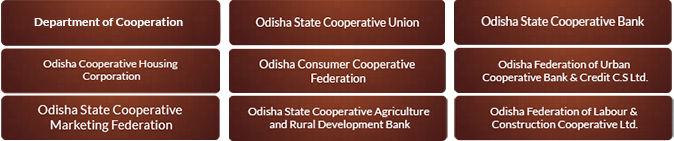 Department Cooperation Odisha State Co-Operative Union Odisha State Cooperative Bank (OSCB) Odisha Co-operative Housing Corporation (OCHC) Ltd Odisha Consumer Cooperative Federation (OCCF) Odisha Federation of Urban Cooperative Bank & Credit C.S Ltd. Odisha Cotton Grower's Cooperative Marketing Federation (COTFED) Odisha State Cooperative Agriculture and Rural Development Bank (OSCARD Bank) Odisha Federation of Labour & Construction Cooperative Ltd.